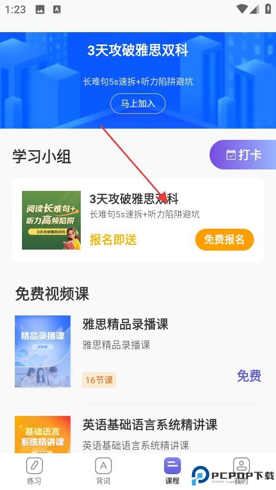 3、课程页面,有学习小组和免费视频课等板块,展示了雅思相关的课程信息,用户可在该页面选择课程进行学习。