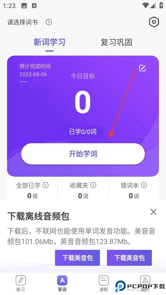 2、背词页面,有新词学习和复习巩固两种模式,用户可选择词书进行学习,还可下载离线音频包,方便在无网络时使用单词发音功能。