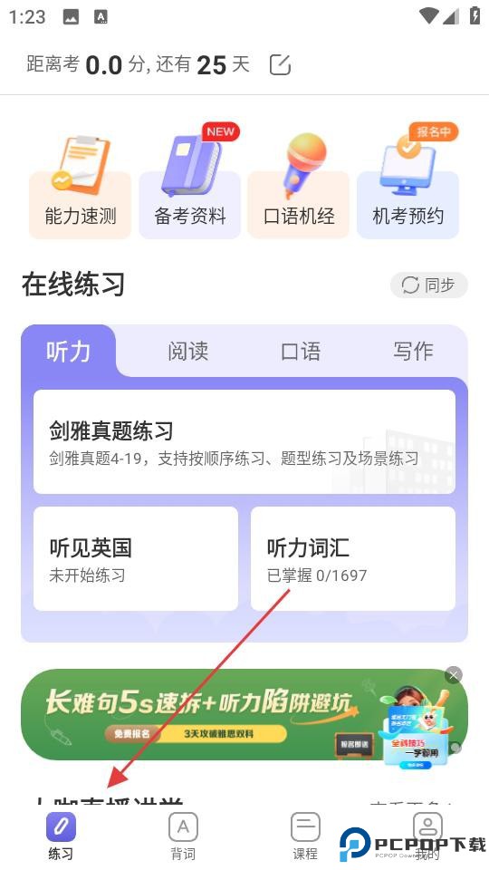 1、练习页面,有能力速测、备考资料等多种学习功能入口,在线练习板块有听力、阅读等分类,还有剑雅真题练习等学习内容。