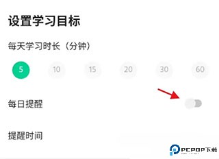 5、进入设置学习目标,找到每日提醒,点击每日提醒右侧的按钮开启此功能。