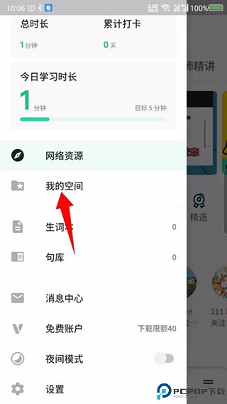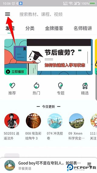 1、打开轻听英语后,点击左上角的三图标。如图所示。