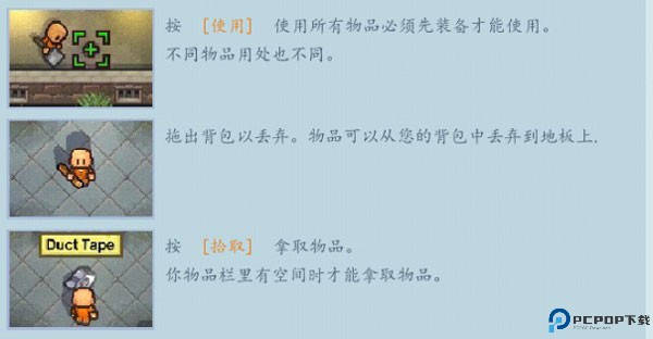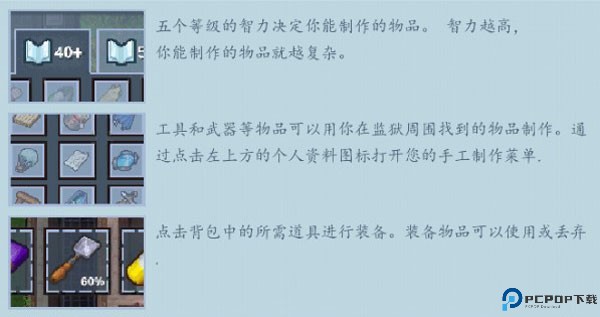 在监狱里,你要开发你的创造力,使用有限的工具来制作各种道具。你可以将日常用品(如肥皂和袜子)组合起来,制造新的武器和工具,以帮助你实现目标。也可以从自助餐厅偷盗叉子,在房间里铺一条隧道,并通过杂志和胶带制作海报以隐藏痕迹。你将很快了解到,胶带解决(几乎)一切!