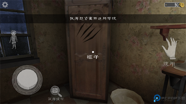 8、藏身地:游戏中可以藏身的地方有大衣柜,大衣柜打开后走到衣柜里然后关上门就可以了。打开的矮柜子,当你的白点指到他敞开的口时屏幕的右上方会有一个图标点击进入后就可以钻进柜子了,这个柜子在二楼。