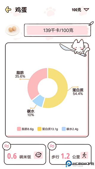 4、在【鸡蛋】页面,就可查看到食物热量和需要消耗热量的运动数值。