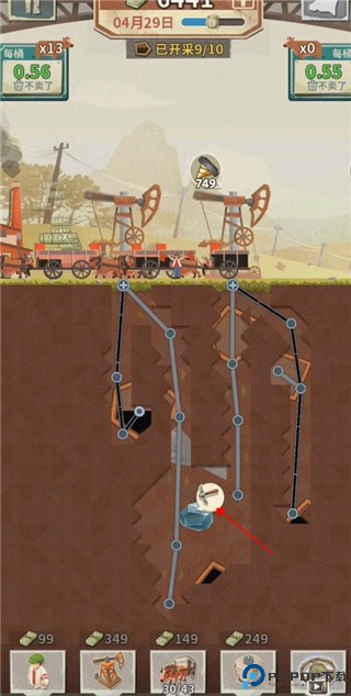 2、首先打开吸油记正版无限金币无限体力版后,点击小镐子,然后开采,开采中可以获得金钱