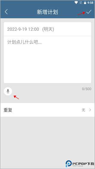 2、手动或语音输入的方式写点未来的计划,根据自身的需要来是否重复这个计划,点击右上角的“√”新增成功。