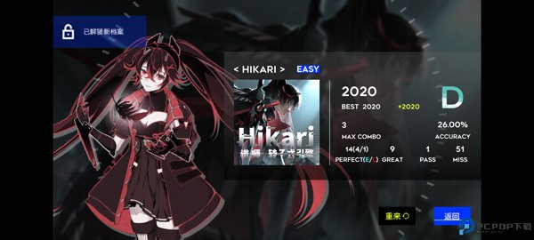 4、设置好后,点击角色,游戏内拥有多首音乐可以挑战,并有着简单、正常、困难三种难度,玩家选择好角色后点击play开始;