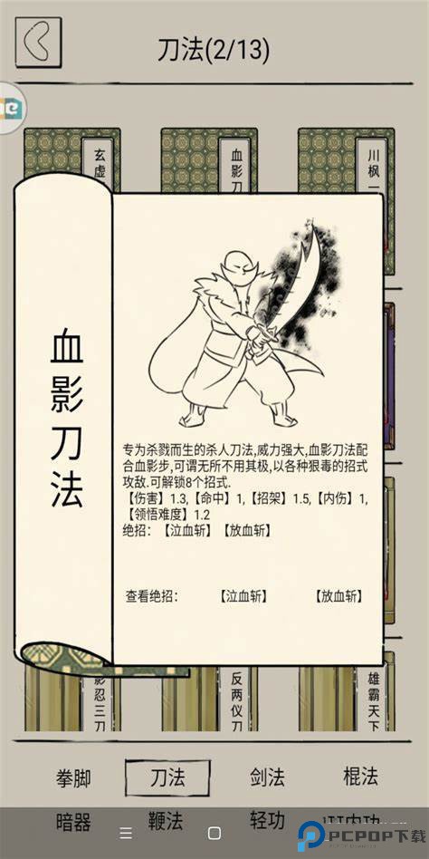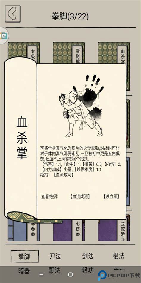 2、第二种选择是拳法,血杀掌。血杀掌的绝招是血流成河,可以造成伤害和附加流血buff,在使流血敌人受伤时还可以刷新流血的持续时间,第二个是蚀血掌,命中目标可以造成伤害并且带来负面血毒buff,总的来说血杀掌的伤害比血影到来的低。