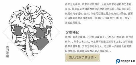 4、门派评价:伤害超高的门派,内功“嗜血功”更是有着“气血越少攻击力越强”的效果,配合“血影刀法”更是伤害爆表。不过血刀门只有两个师父,习武之路也注定坎坷,绝学更是要等150级之后才可以使用,注定是一个后期强势的门派。