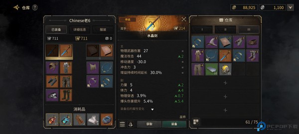 3、角色装备栏分为武器栏、护甲栏和快捷栏,在背包中存放战利品,在仓库存放储备战利品,各自有容量限制。
