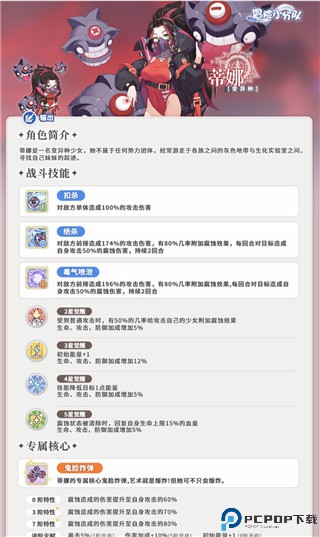 第五位:莉迪亚,变异的副C,跟判罪一样,可对有异常状态的敌方有伤害加成,并且击杀目标有伤害加成和追击〈必定暴击〉,这就是我把她放在第五占位的原因,前面有判罪压低血量,双毒挂状态,那么她的作用就是收割,一锤一个小朋友