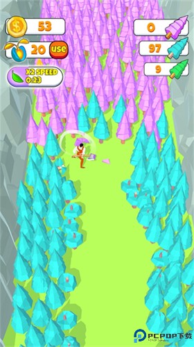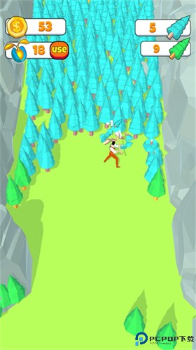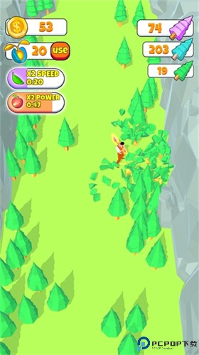 2、挥动斧头,通过点击或滑动屏幕控制斧头砍伐树木。