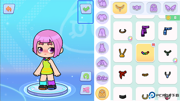 3、之后玩家可以为角色选择五官、服饰、帽子、眼镜、发夹、衣服、头饰等等,创建好后点击上面√即可