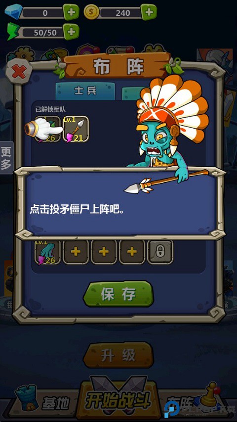 新解锁的僵尸必须上阵才能使用,点击“布阵”,点击要上阵的僵尸并保存。