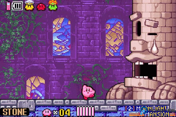 12、万能拳,(跟普通卡比样子差不多,只是能力改变了)b键会用木锤打击敌人,在空中,用翻滚能力可把敌人杀死,(除BOSS外)上方向键+b键会够成剑气盾,下方向键+b键变石头。