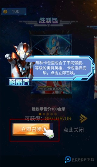 2、不同卡包包含不同强度与等级的奥特英雄角色。选定卡包后,点击立即召唤按钮执行抽取操作。