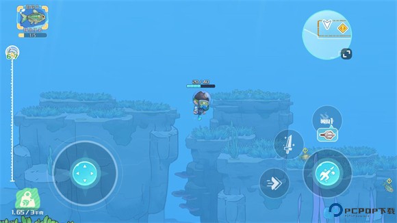 6、捕鱼过程中左边控制角色移动,右边可以发射鱼叉来捕鱼,角色头顶是氧气,消耗完就需要返回岸上。