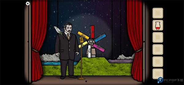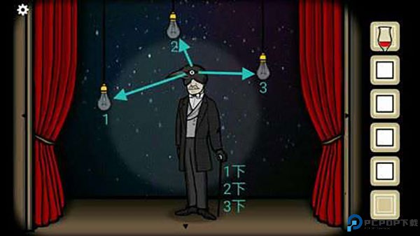 11、拉开帷幕,点击男人,根据男人伸出的手指头个数点亮灯泡,接着根据拐杖敲击的次数点亮灯泡,最后根据鸟眼望着的方向点亮灯泡,第四个节目结束。