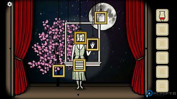 7、将收集到的物品放入盆中使其高度一致,接着点击女人,从女人嘴里获得「花」,退出,再点击帷幕。
