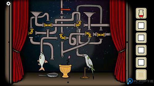 10、拉开帷幕,将花放入花盆,调整水管点击上面的阀门,再点击花获得「鸟食」,调整水管将鸟食从左边的漏斗投入,点击鸟获得「蛋」,调整水管将蛋从右边的漏斗投入,使其掉落在锅里后获得「虫子」,再次调整水管从右边的漏斗投入,点击鱼,第三个节目结束。