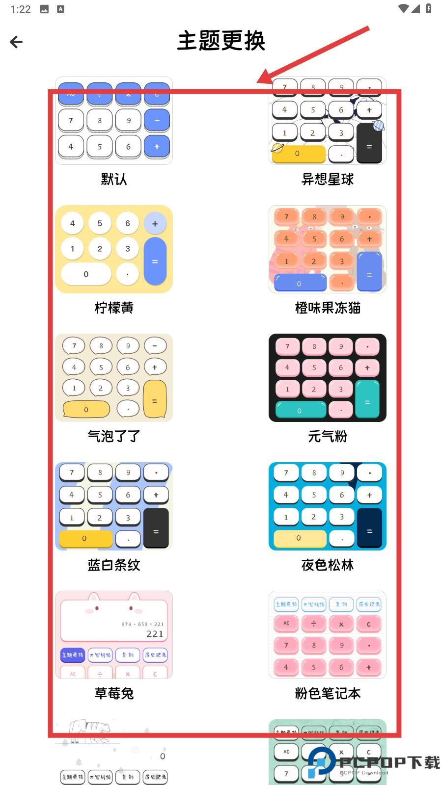 3、在主题更换页面,浏览所有可选主题,点击想要更换的主题样式,完成计算器主题更换操作。