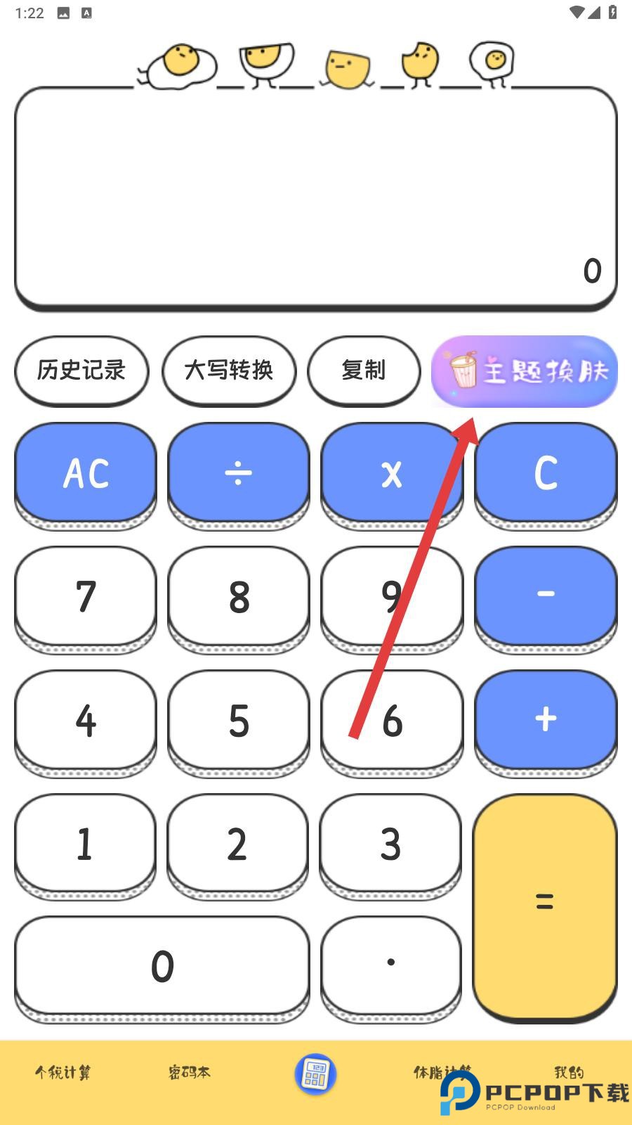 2、在计算器主界面,仔细查找界面布局,于功能按键区域中,定位到标注为主题换肤的按钮,点击该按钮,跳转进入主题更换页面。