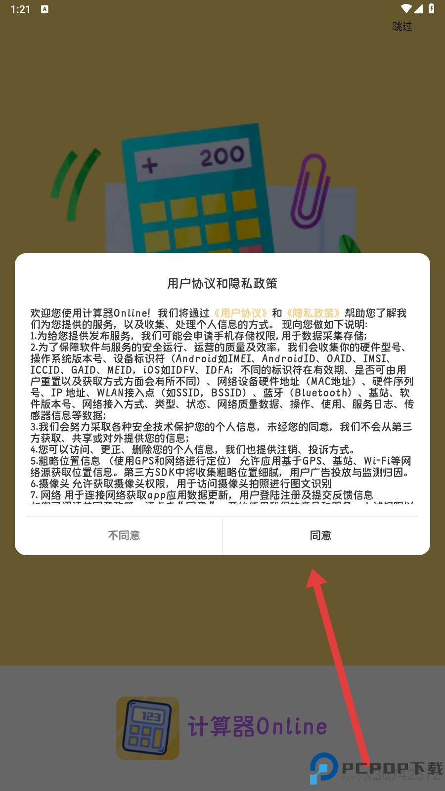 1、点击用户协议和隐私政策弹窗里的同意按钮,确认接受相关协议与政策,进入计算器主界面。