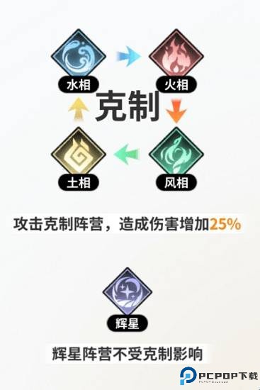 游戏中有四种基础属性阵营,它们之间存在循环克制关系,攻击克制阵营可造成额外25%的伤害加成: