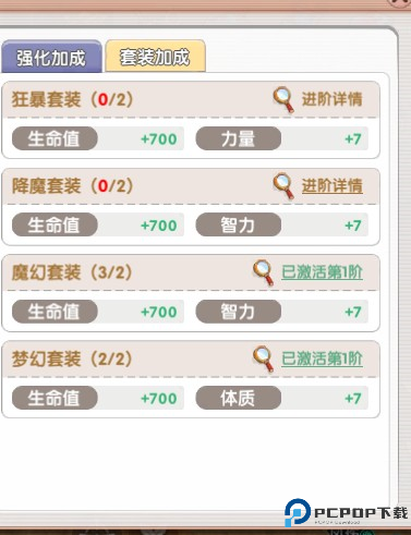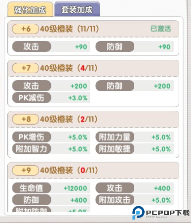 5、强化加成:装备库中的装备会带来额外的强化祝福。20级紫装需达到+6强化才能献上这份祝福;30级后,唯有橙色传说装备才有资格提供强化加成,且同样需要达到+6门槛。随着等级提升,这些祝福也会水涨船高:20级装备最高可获+7恩赐,30级可达+8,40级则能攀升至+9。6、套装加成:套装效果如同三阶天梯:穿戴两件即可点亮第一阶光芒,随着收集完整,将逐步解锁更强大的力量。每一阶都蕴含着独特的属性馈赠,等待勇士来完整激活。