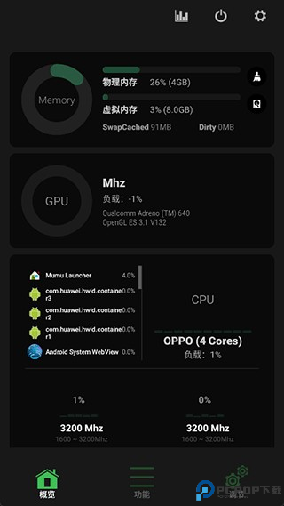 4、获取到设备的root权限后再次打开这个app就会发现其和scene5的界面类似,例如对设备的内存、cpu、电量的使用运行情况都以图表的形式列举,让用户对手机设备的运行情况了如指掌