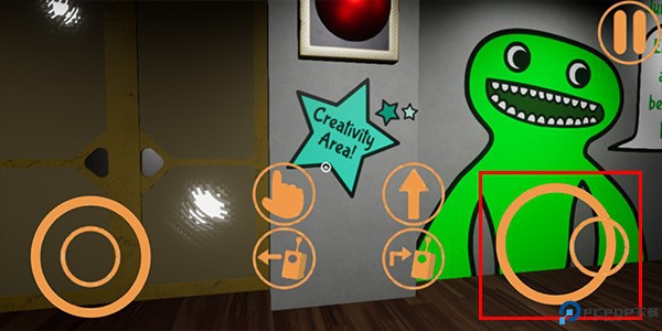 2、进入游戏后讲解一下如何操作,右侧摇杆为移动键,手指按钮为互动键