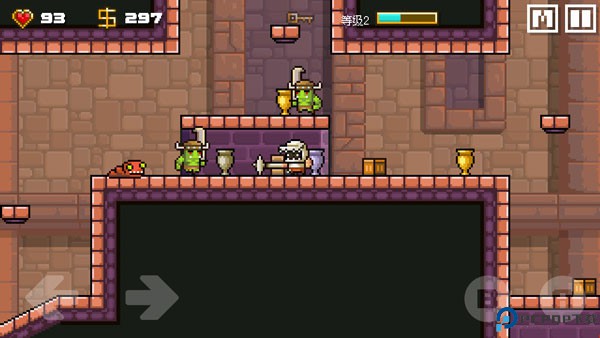 游戏的操作不是很难,在游戏的屏幕左下方有两个方向键控制左右。B键是攻击键,A键是起跳键,长按是下跳。大家注意不要被怪伤到。