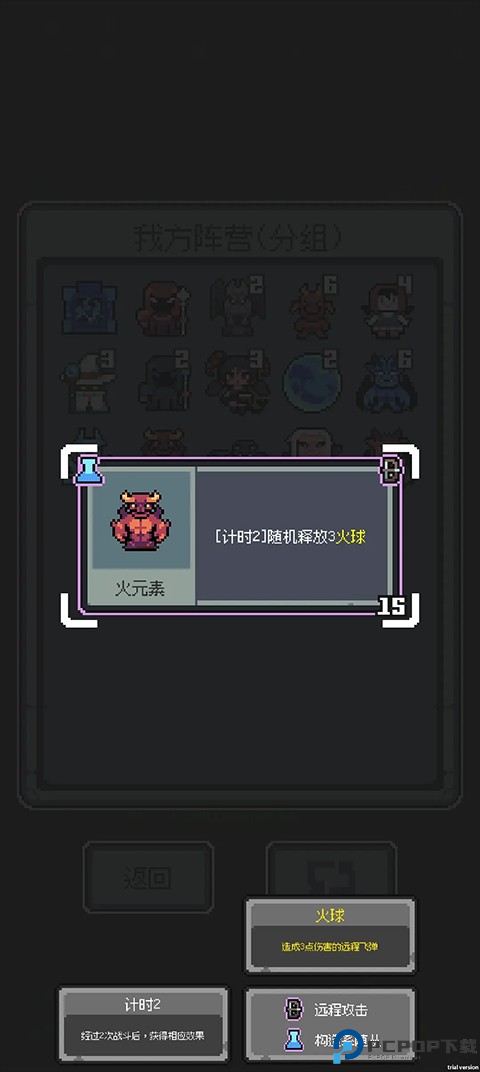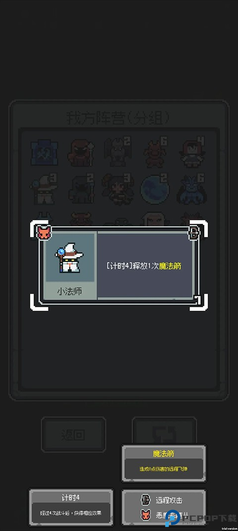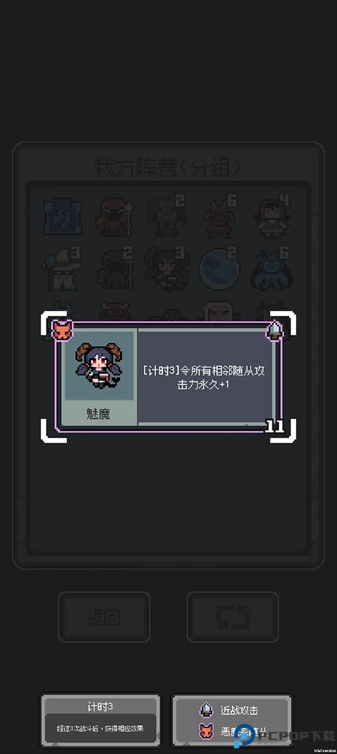 2、每个回合开始前,可以对已经出现的士兵进行删除操作,清理掉战斗力低下的士兵,在中后期很重要。在回合结束时有经典肉鸽三选一,可以获得新的兵种或增益道具,以强化战斗输出,有很好的选择策略性。