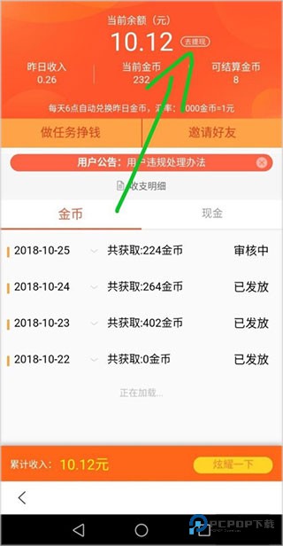 3、赚到的金币去哪看呢?在“我的”页面找到“金币明细”(或者类似记录金币的地方),点进去后右上角就有个醒目的“提现”按钮,点它就对了。