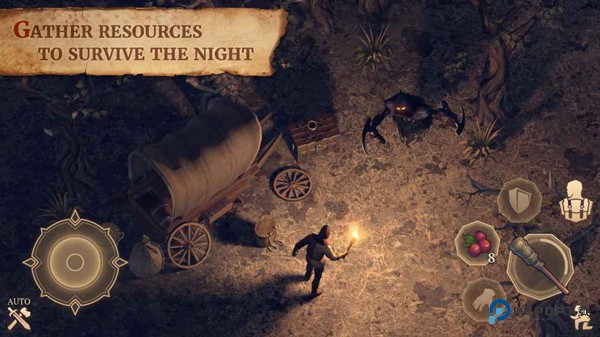 遭遇夜灵(紫色血条)时火把可驱散威胁,同时开始资源积累。