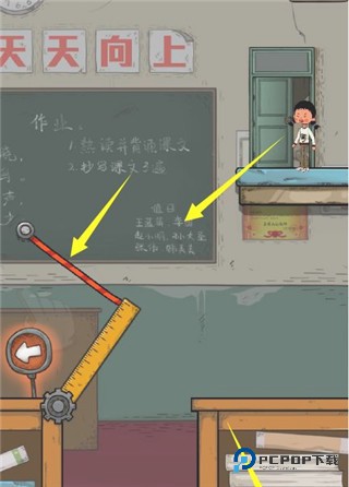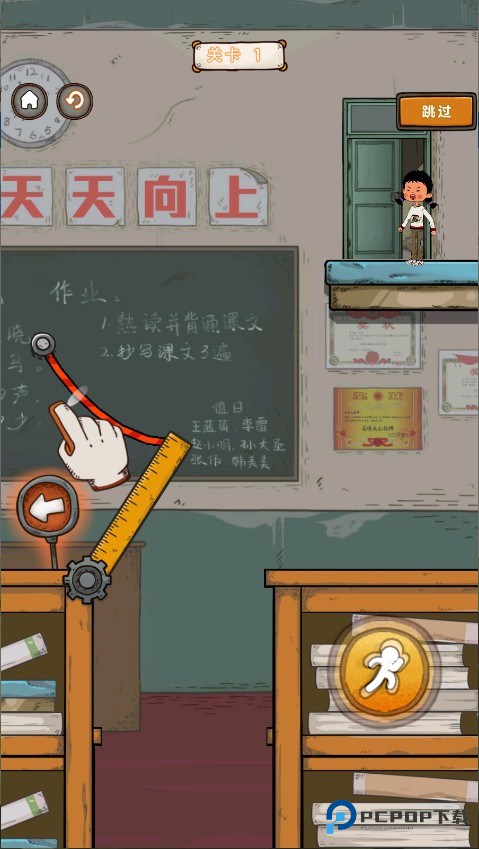 启动关卡后,立即点击场景中的红色绳子触发动作。待尺子完全下落后,迅速点击界面右下角奔跑图标推进剧情。