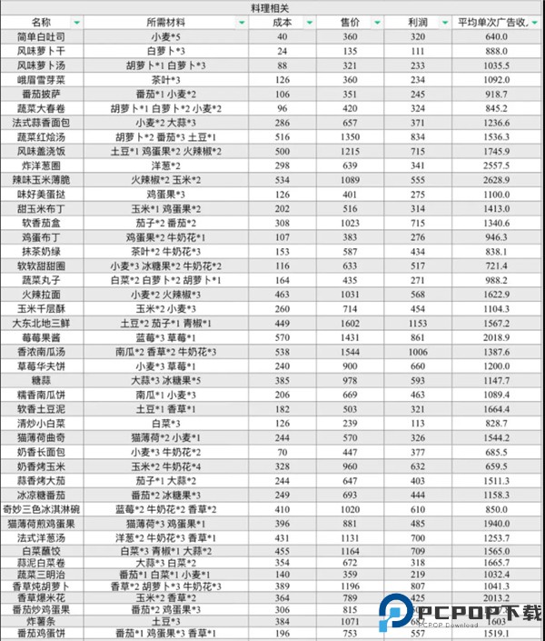 注意:这个平均单次广告收入,我的计算方法如下,以风味萝卜汤为例,看4次广告得到40个胡萝卜,再看5次广告得到120个白萝卜,这两次凑一起刚好可以做40个风味萝卜汤,所以单次广告收入40* /9=1035.5。我觉得这样算看广告比较合适,我比较喜欢做蒜香面包种一次大蒜两次小麦很方便~