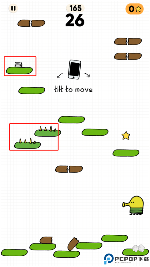 3、摇动手机以控制角色的跳跃和移动方向,并保持在线跳跃,玩家必须掌握自己的跳跃节奏,上面的平台是固定的,但位置设置是随机的。