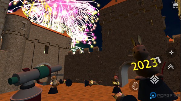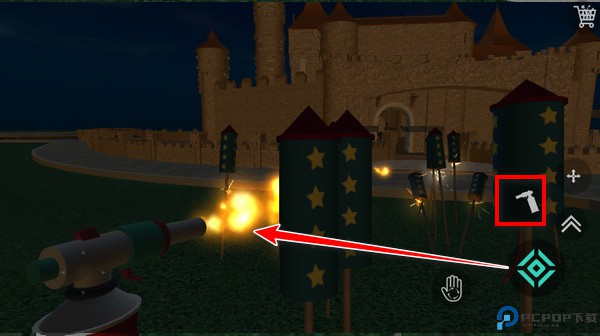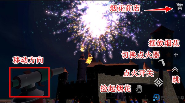 3、进入地图,现在正式开始教大家烟花模拟器这些按键功能:屏幕左边是移动,右边的按钮可以捡起烟花、摆放烟花、拿出点火器点火、跳跃,然后就是右上角的烟花商店按钮。