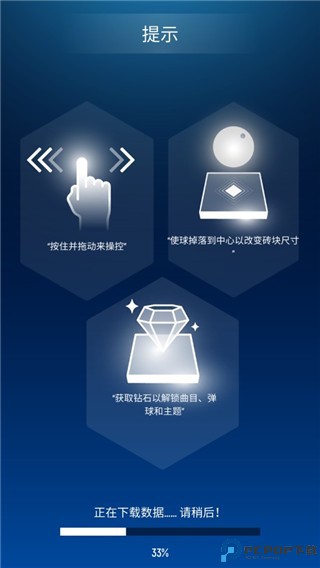 4、按住并拖动来操控,使球掉落到中心以改变砖块尺寸,获取钻石以解锁曲目、弹球和主题;