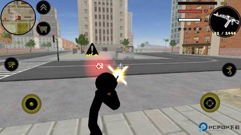 左侧移动、加速,右侧绳索,攻击(跳跃),跳跃,右上侧的武器更换以及血量、经验的显示都实时更新,一览无遗,凭借着大家自由的玩法,与其他帮派的人物进行交火,期间杀人能够获得经验,杀多了会产生星级,警察和其他附近角色会特殊照顾你对你展开火热的进攻,而如何存活,如何将其他人物击杀则是你所需要完成的任务。
