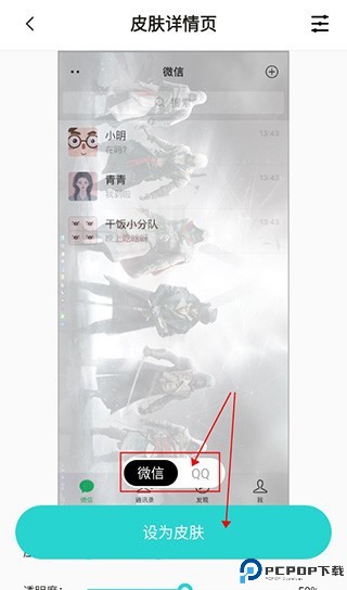 同样在壁纸界面,点击下方的应用皮肤即可开始设置,可以选择设置微信皮肤还是QQ皮肤,选择完之后可以点击下方的“设为皮肤”就可以完成应用皮肤的设置啦。