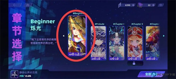 左右拖动屏幕可查看其他章节,点击任一图标即可进入对应章节曲目选择界面。下面的AP代表本章节内乐曲的满分个数,CL代表解锁并游玩乐曲的个数(进入章节选择不同的难度,外面的AP和CL显示也会有对应的变化)