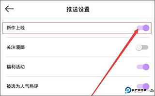 3、在推送设置页面上,我们会看到【新作上线】按钮,点击按钮将按钮点暗就能解除更新通知啦!