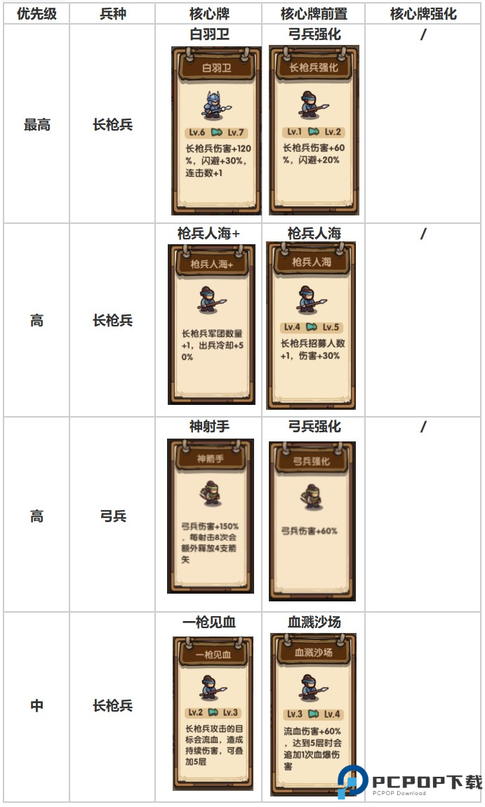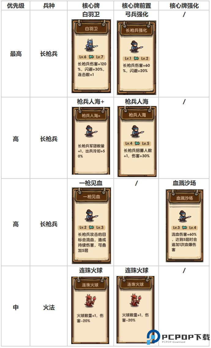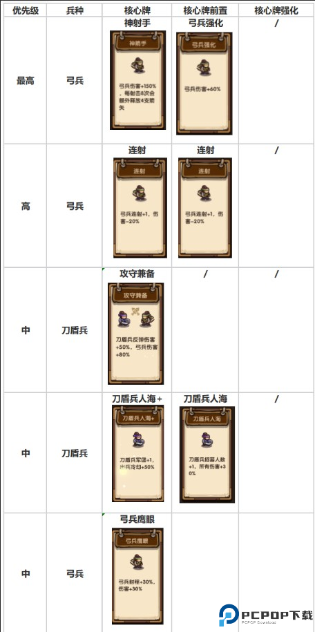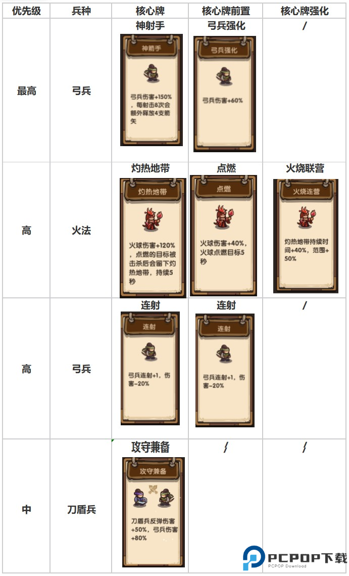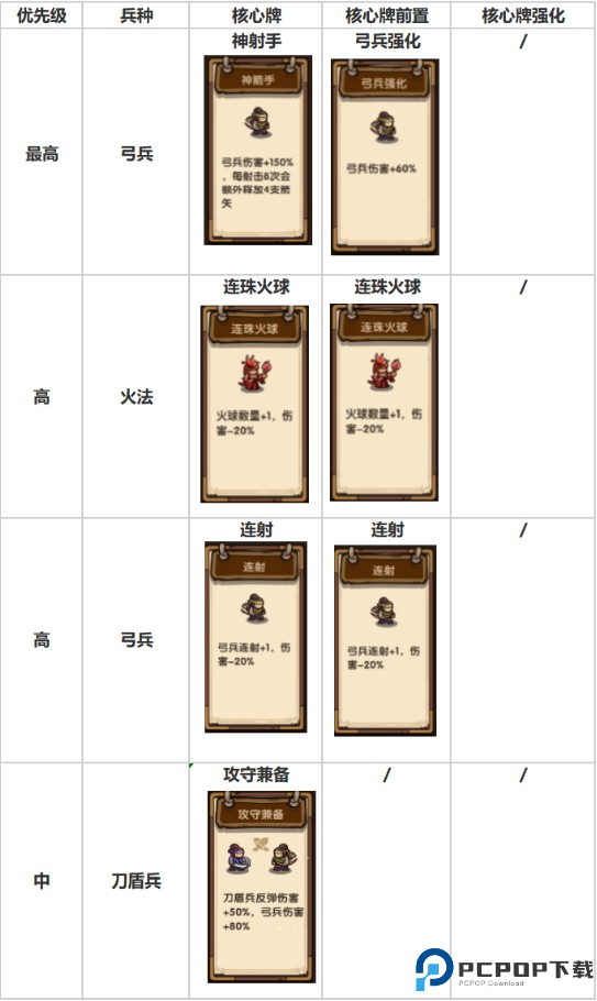 优先铺满兵种,弓兵>刀盾>火法师>其他,后续的核心牌按如下顺序推荐选择
