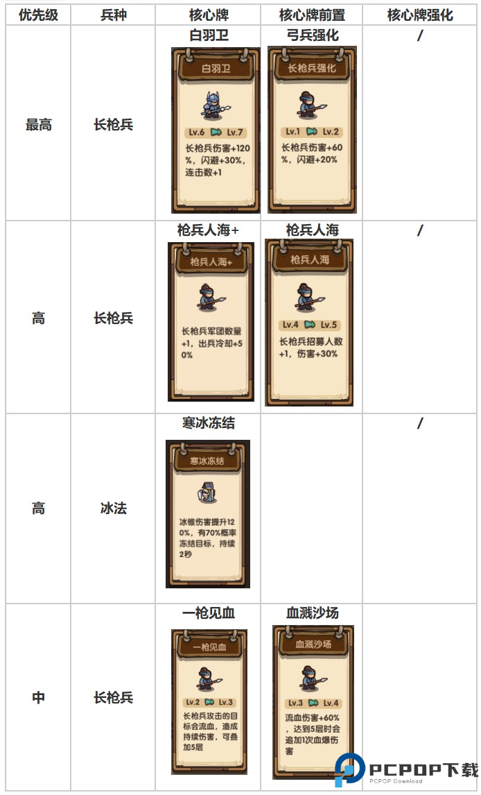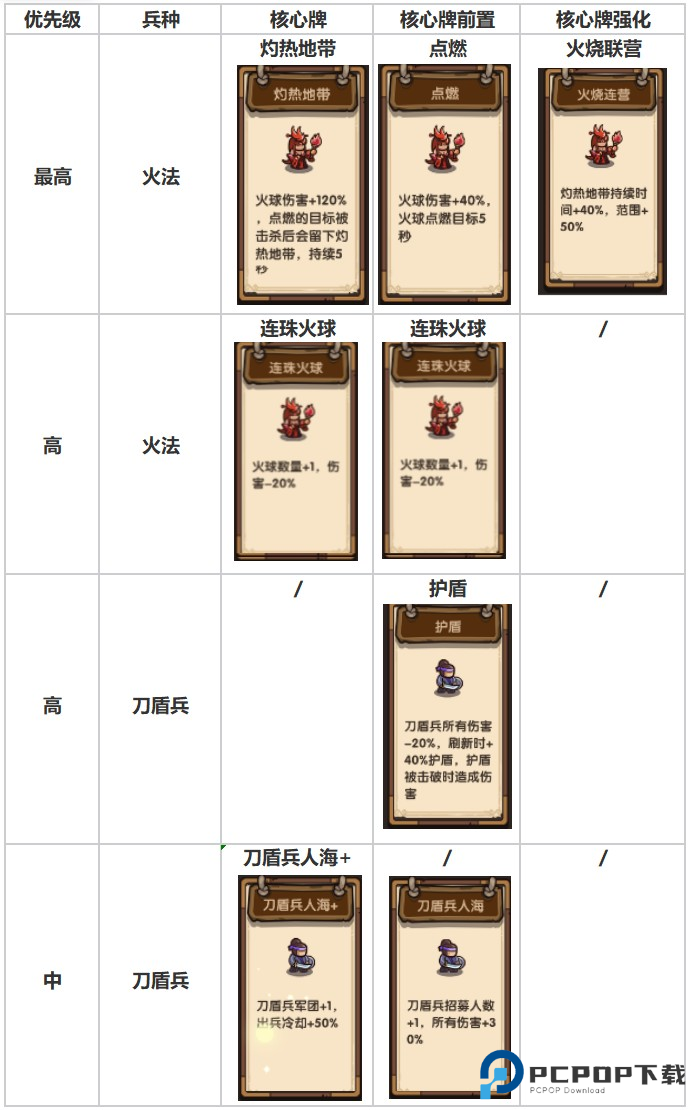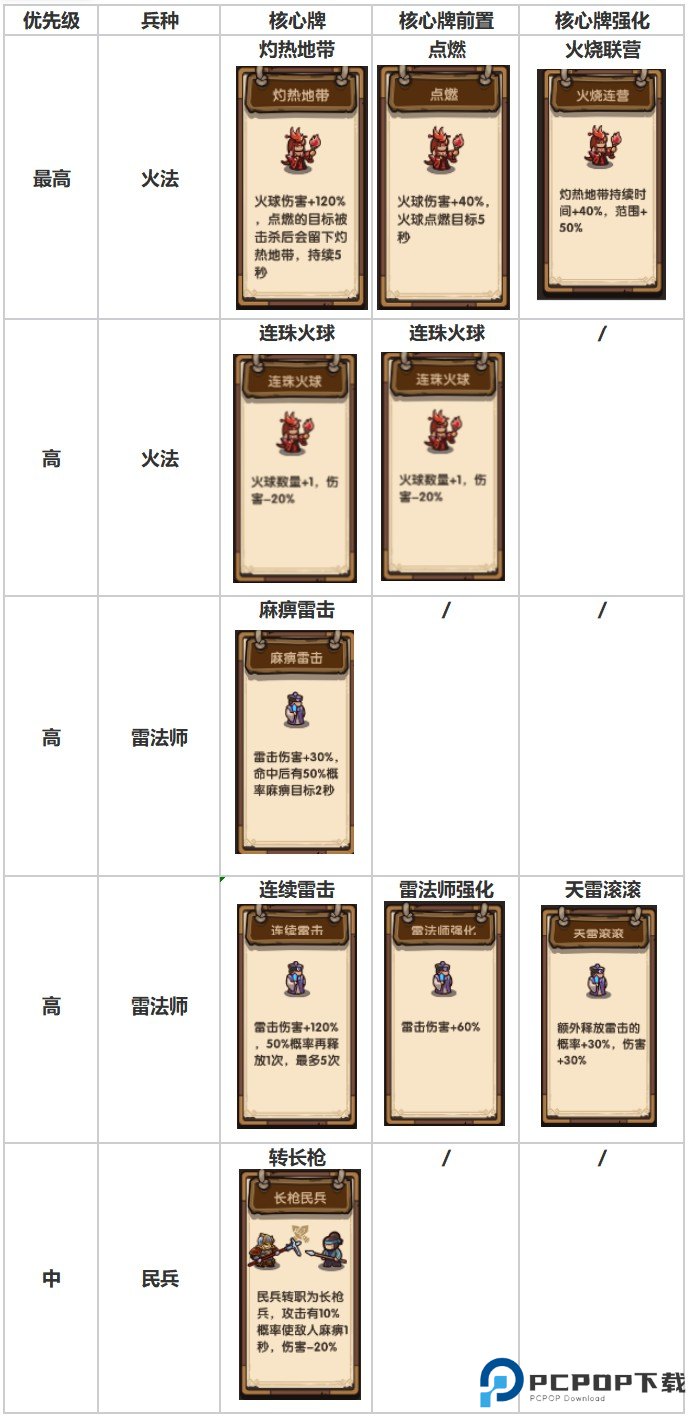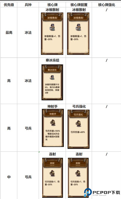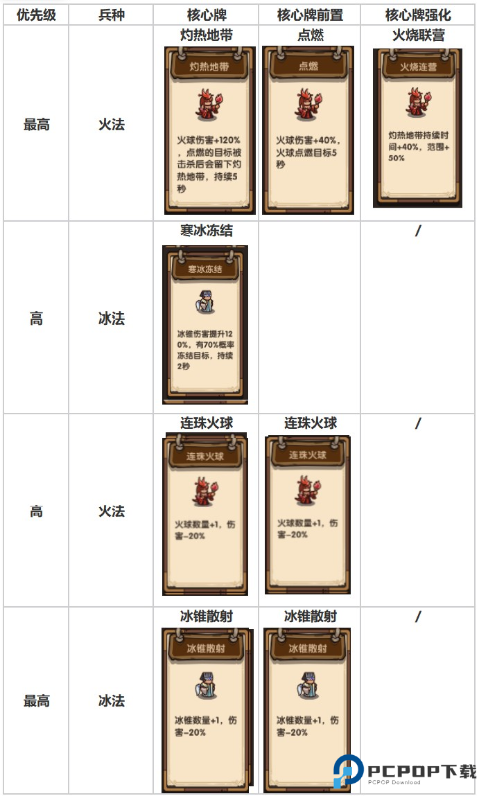 优先铺满兵种,火法=冰法>其他,后续的核心牌按如下顺序推荐选择