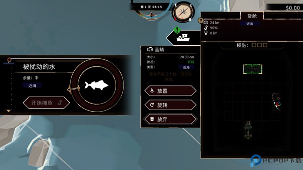 4、我们可以操控方向键进行渔船移动,然后调整方向以及利用船锚进行渔船各种操作。