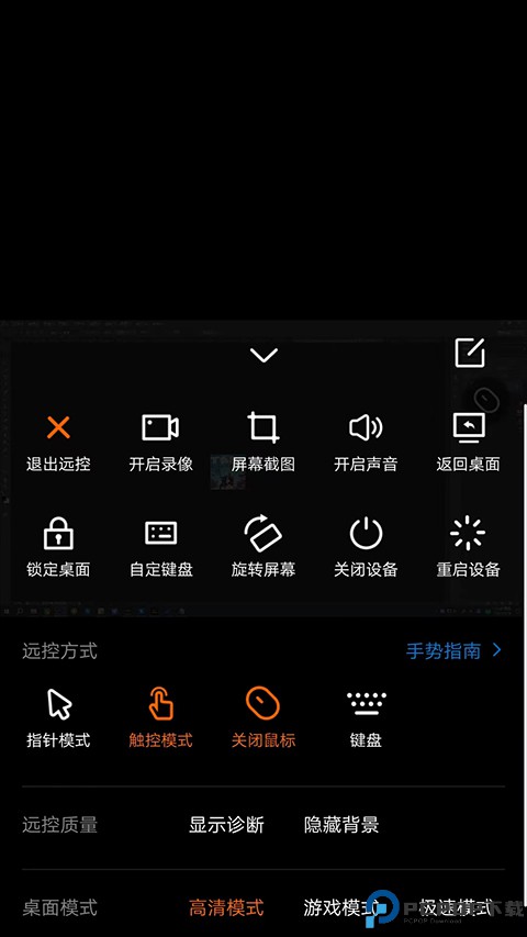 8、选择右下角【箭头】图标,可进行【退出远控】、【开启录像】、【屏幕截图】等快捷操作以及对远控方式、指针模式、远控质量、桌面模式的设置,