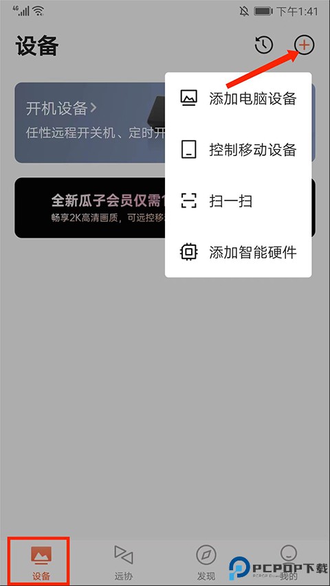 2、进入【设备】界面,选择右上角【+号】图标可进行电脑设备、控制移动设备、扫一扫以及添加智能硬件的操作,用户可根据需求选择使用,