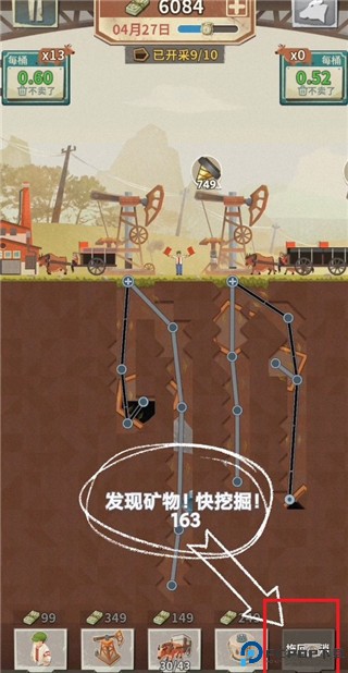 1、发现矿石,点击右下角探测仪将矿石挖出来。
